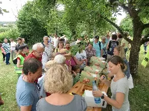 Erstmals mit im Programm dabei war die Öko-Wanderung unter der Leitung von Irmgard Keß unter dem Motto „Woher kommt´s?“. Über 100 Wanderer folgten der Tour von Greßthal nach Schwemmelsbach und machten Station an der Bäckerei Thomas Wolz, beim Öko-Landwirt Martin Münch, bei Ewald Keß von der Mostkelterei Greßthal und Imker Reinhold Hertlein. Die Wanderer erhielten vielfältige Einblicke und wurden auf Zusammenhänge hingewiesen – mit dem Preis, den wir für unser Brot zahlen, nehmen wir Einfluß auf das Fortbestehen von Handwerksbäckereien und auf die Art, wie Landwirtschaft betrieben wird. Unterstützen wir die Imker vor Ort, so hat das Einfluß auf unsere Obsternte.