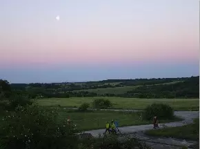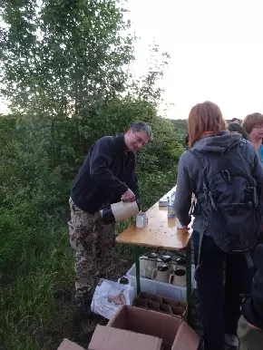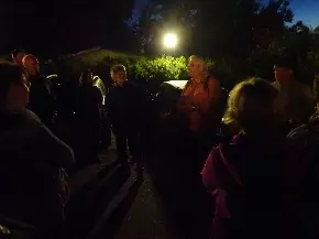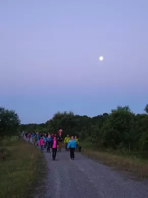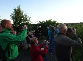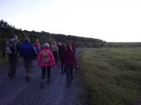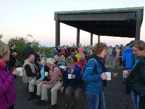 ...so hieß es bei der Sonnenaufgangswanderung (12 km) ab 3:30 Uhr unter der Leitung von Dittelbrunns Bürgermeister Willi Warmuth. Kapp 80 Wanderer versammelten sich zu früher Stunde am Gasthaus Hühnernest und liefen gemeinsam durch die nächtliche Flur zum ehemaligen Truppenübungsplatzgelände der US-Streitkräfte, dem „Brönnhof“ hinauf. Dort erwartete die Gruppe gegen 5.18 Uhr ein ganz besonderes Ereignis: der Sonnenaufgang, mit freier Sicht vom "Feldherrenhügel". Erst zeigte sich ein orangenfarbener Streifen am Himmel, dann folgte der Feuerball. Zur Stärkung gab es Kaffee und frische Hörnchen. Die Frösche im nahegelegenen Teich quakten und der Wildpferdenachwuchs kam neugierig heran. Zurück ging es erneut durch die Flur, an der Lauerbachkapelle vorbei. Am Gasthof Hühnernest erwartete die frühen Wanderer ein stärkendes Frühstück- mit frischen Kräutern und -wer wollte - konnte sich ab 10 Uhr der nächsten Tour mit anschließen.