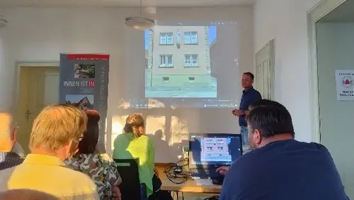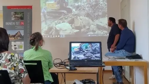 Beiden ist es ein großes Anliegen, den Charakter alter Gemäuer zu erhalten. Genauer hingeschaut begegnet einem der hiesige Sandstein überall: als Sitzgruppe, Bildstock, am Brunnen, in Kirchen und Schlössern, als Treppenaufgang oder Türumrahmung. Die Wertschätzung der vergangenen Baukunst ist maßgeblich für ihren Erhalt. Welche Tricks es hierzu gibt wusste Markus Full. Er stellte die hinterlüftete Fassade vor, die dazu beiträgt das ursprüngliche Mauerwerk trocken zu halten. Der Clou sind offene Fugen und ein gewisser Abstand zur Gebäudewand, sodass die Luft zirkulieren kann. Zahlreiche Fragen aus dem Publikum bestätigen das große Interesse am Thema.