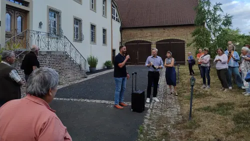 Der Dorfspaziergang führte weiter in Richtung Theilheimer Schloss. Roland Sauer, der Eigentümer, begrüßte und informierte über die Geschichte des Schlosses, die eng mit dem Adelsgeschlecht der „von Erthals“ verbunden ist. Das Wappen findet sich noch heute über dem Eingangsportal, am Haupteingang sowie im Stil der „Lüftelmalerei“ in einem Nebengebäude, das in jüngster Vergangenheit noch als „Spanferkelranch“ dem geselligen Beisammensein diente. Seit 1883 ist das herrschaftliche Anwesen im Besitz der Familie Sauer. Konrad Roth wusste weitere Geschichten über einen Tüftler und Bastler der Ballonfahrt zu erzählen, der zu Zeiten Napoleons in Rußland seine Erfindung bewarb und sich dann nach Theilheim zurückzog, um weiter in die USA zu reisen.