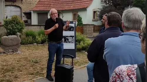 Eine weitere Station war der steinerne Kinderwagen am Denkort Deportation. Er erinnert zusammen mit einer Tafel an die jüdischen Mitbürger, die im September 1942 aus Theilheim deportiert wurden. Konrad Roth wusste viel über die fast 500 Jahre lange Geschichte der Juden in Theilheim zu erzählen, die einst einen großen Prozentsatz der Dorfbevölkerung ausmachten. Gezwungenermaßen als Händler tätig, sorgten sie für geschäftiges Treiben in Theilheim und prägten mit ihren Anwesen das Ortsbild.