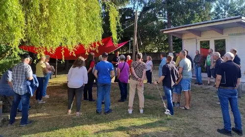 Emilie Brehm ging auf die Geschichte des Kindergartens und die heutige Nutzung der Räumlichkeiten ein. Einige Anwesende konnten sich noch an die „guten alten Zeiten“ erinnern, was für Erheiterung sorgte. Dann ging es los in Richtung „Römmeltsgarten“, einer begrünten „Oase“ in Kindergartennähe, mit altem Baumbestand und Spielgeräten, die dank ehrenamtlichem Engagement aufgekauft und hergerichtet werden konnte. Ein altes und doch neues Spielangebot ist das Trampolin, das mit Mitteln des Regionalbudgets des Amtes für Ländliche Entwicklung und der ILE Oberes Werntal erneuert wurde. Emilie Brehm erläuterte Details dazu. Christian Zeißner stellte zudem Projekte des Sportvereins vor, die ebenso über das Regionalbudget verwirklicht werden konnten.