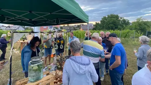 Vor allem durstig machten sich die interessierten Zuhörer auf den Weg in Richtung Bioweingut Huter. Es ging direkt hoch in den Weinberg, von wo aus sich ein schöner Rundumblick über Theilheim und Umgebung bot. Eine Insel mit liebevoll hergerichteten Köstlichkeiten von Katrin Huter wartete auf die Ankömmlinge. Bei Speis und Trank präsentierte Sebastian Huter sein Weinsortiment und stellte die Arbeit im Weinberg vor. Der überzeugte Bio-Winzer, der nahezu ausschließlich Handarbeit leistet, ging insbesondere auf die Themen Bewässerung und Schädlingsbekämpfung ein. Der Abend klang mit gemütlichem Beisammensein und guten Gesprächen aus. Ein gelungenes Format, das in Kronungen seine Wiederholung finden wird.