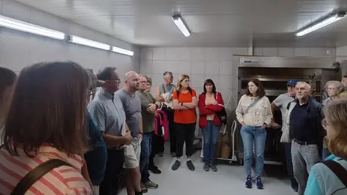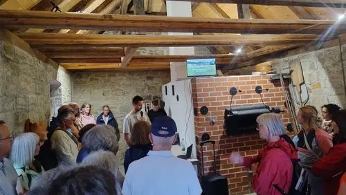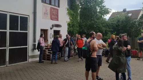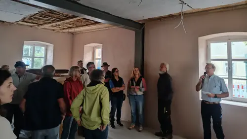 Weiter ging es zur Baustelle „Alte Schule“, die über die Städtebauförderung gefördert wird. Bürgermeister Ludwig Nätscher erläuterte die Umbaupläne der Gemeinde. Das Gebäude selbst steht unter Denkmalschutz, auch wurden im Kirchenumgriff Knochen vom einstigen Friedhof gefunden, die es sorgfältig zu begleiten gilt. In Ergänzung wird der Spielplatz erneuert sowie der Bereich für die Maibaumaufstellung. Die umfassenden Baumaßnahmen werden noch bis Mitte 2026 andauern. Werner Göbel ging auf die neue Idee des Bibelgartens ein, der im Kirchenumgriff mit Stele und einer entsprechenden Bepflanzung entstehen könnte. Auch könnte überregional das Thema Kelten miteingebunden werden. Abschließend ging es zurück zum Bio-Hof Karg. Bei leckeren Köstlichkeiten gab es Zeit für gute Gespräche und gemütliches Beisammensein.