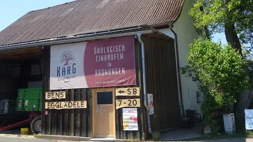 Über die Jahre kam es auf dem Hof Karg zu Anpassungen im Betriebsablauf und auch zu baulichen Veränderungen der Hofstelle. Einst als Aussiedlerhof errichtet befindet sich der Hof nun gut integriert im Ort nahe der Kirche. Damals stand die Milchviehhaltung im Vordergrund des Wirtschaftens. Heute sind es der Ackerbau und die Hühnerhaltung, alles in ökologischer Bewirtschaftung. Anstelle der alten Mistlege wurde eine Halle mit Werkstatt errichtet. Der ehemalige Kuhstall dient inzwischen der Futterabfüllung und Weiterverarbeitung. Auch kam mit Mitteln des Öko-Kleinprojektefonds ein neuer Verarbeitungsraum für Brot hinzu. Der bereits bestehende Hofladen wurde erneuert. Zusätzlich lädt ein „Egglädle“ in Selbstbedienung ein, regionale Bio-Produkte kennenzulernen.